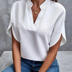 Die Bluse « Isalie » verkörpert schlichte Raffinesse und feminine Leichtigkeit. Mit ihrem leichten Stoff und dem eleganten V-Ausschnitt ist sie die ideale Wahl für stilbewusste Frauen, die Komfort und Ästhetik schätzen.