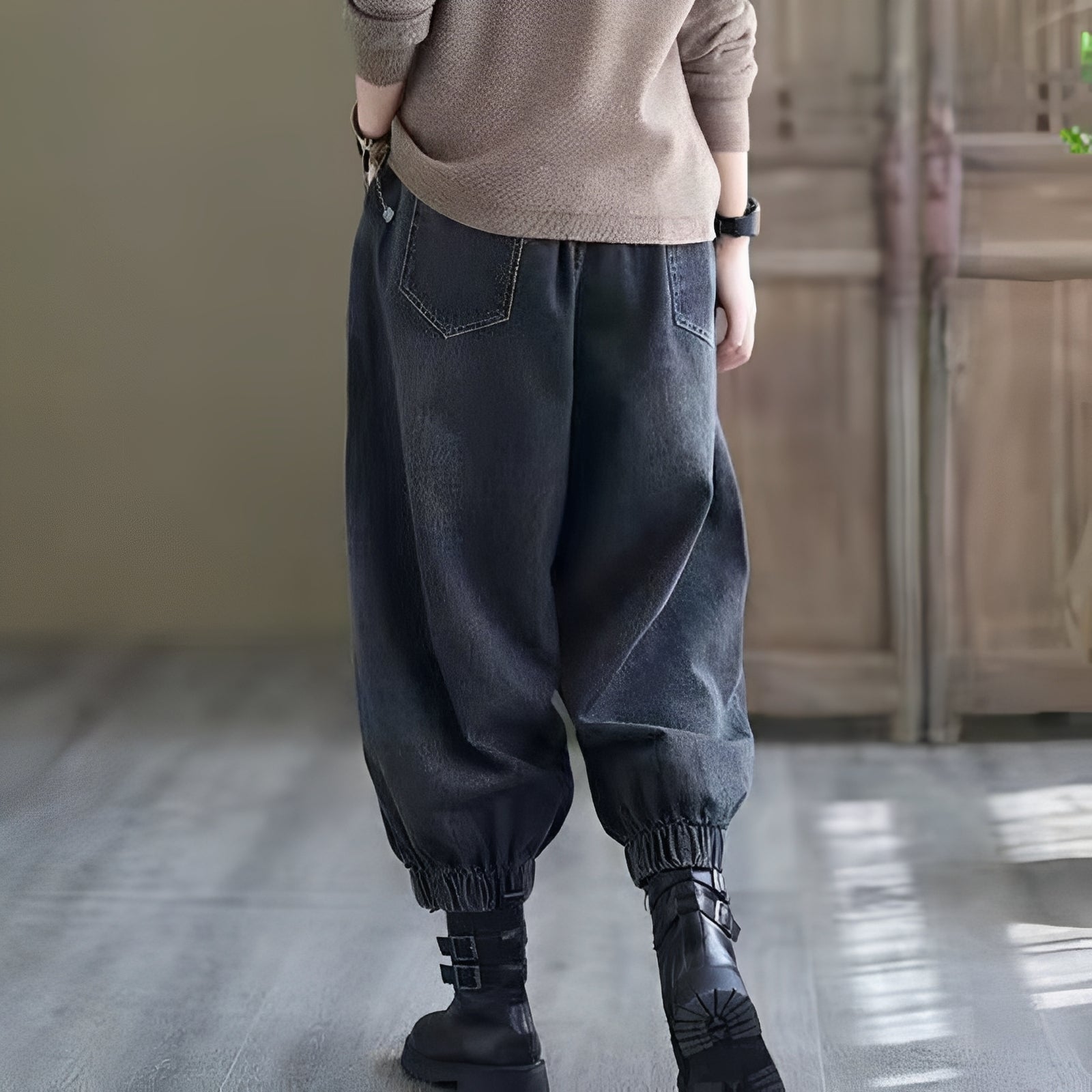 Die „Maisy“-Jeans zeichnet sich durch ihren elastischen Bund und den weiten Schnitt aus, die außergewöhnlichen Komfort bieten. Praktische Taschen ergänzen ihr funktionales Design. Das schwarze Vintage-Aussehen verleiht jedem Outfit einen trendigen Retro-Touch. Ideal für den Frühling und den täglichen Gebrauch, lässt sie sich leicht mit lässigen Oberteilen kombinieren.