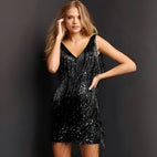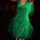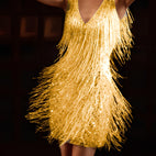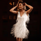 Seien Sie im Rampenlicht mit unserem Cocktailkleid mit Fransen und Federn, elegant und reizvoll bis ins kleinste Detail.