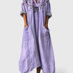 The Althea dress captivates with its authentic bohemian flair and natural elegance. Adorned with subtle floral embroidery, it adds a feminine and artisanal note to your outfit. Its flowing and relaxed cut allows a light drape that highlights the silhouette while offering optimal comfort. Made from a breathable fabric, it is perfect for sunny days and moments of relaxation. A versatile piece, ideal for a chic and casual everyday style.