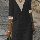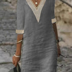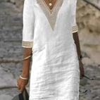 Enjoy warm days with total ease thanks to this casual and stylish dress from Couture-Moda. The dress is made from a breathable linen blend and combines comfort with a touch of romance. The V-neckline with delicate lace trim adds feminine accents, while the loose fit and three-quarter sleeves ensure comfortable wear – ideal for relaxing outings or a comfortable stroll in the city.