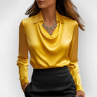 Discover our Laurentine long-sleeved satin blouse for refined women, designed to bring a touch of luxury and natural grace to your everyday outfits. The soft satin fabric falls beautifully, creating a smooth and polished look that flatters all shapes. Its elegant draped neckline adds a graceful touch, making this blouse perfect for work and special occasions. Light and comfortable, it offers all-day ease while maintaining a neat appearance. Wear it with trousers or a skirt, or pair it with jeans for a chic and relaxed look.