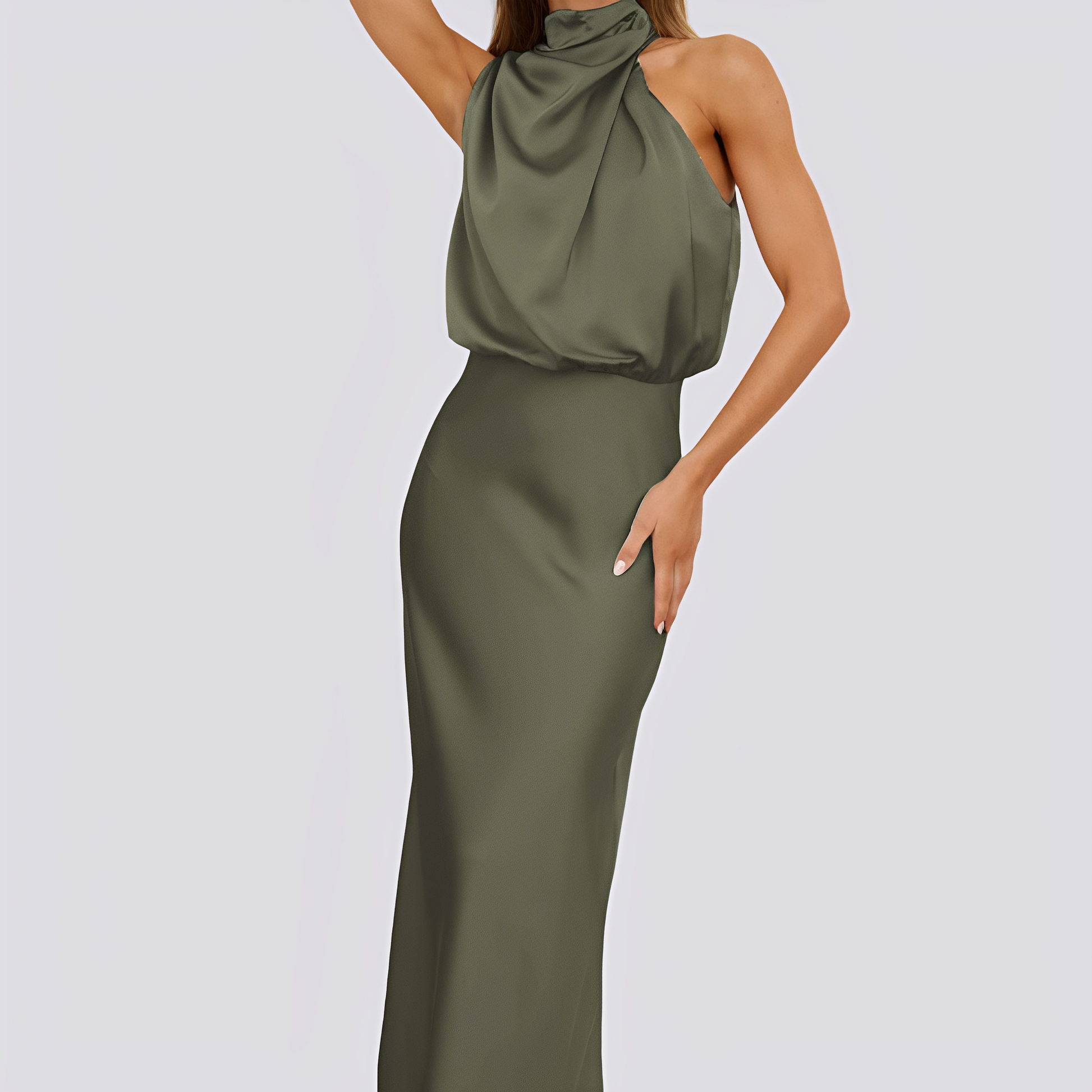 This evening dress charms with its elegant halter neckline and feminine, flowing silhouette. The high-quality fabric ensures pleasant comfort while highlighting a refined look. Perfect for evenings, celebrations, or special events. A dress that merges classic elegance with contemporary glamour.