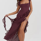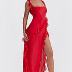 Draw all eyes with the Couture-Moda women's long dress – Adjustable straps – Ruffle detail – High slit – Graceful cut. This stunning long dress features adjustable shoulder straps, an elegant high slit, and playful asymmetrical ruffle details for a feminine silhouette.
