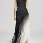 Cette robe époustouflante présente un haut ajusté flatteur et une jupe fluide à étages asymétriques, réalisée en tissu léger et semi-transparent pour des mouvements gracieux. Idéale pour les événements formels et les occasions spéciales, cette robe élégante offre un look chic et raffiné.