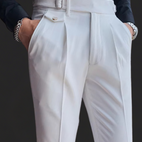 Ces pantalons combinent la couture anglaise avec une apparence moderne. Confectionnés dans un tissu léger et aéré, ils sont parfaits pour le printemps et l'été. Le devant plissé et la taille ajustable garantissent une silhouette marquée, tandis que le haut ample et les jambes effilées apportent style et confort. Que ce soit avec une chemise ou un t-shirt, ils ajoutent une allure élégante et décontractée à chaque style.