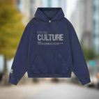 Ce sweat à capuche bleu foncé avec l'inscription « POUR LA CULTURE » est parfait pour un look contemporain et détendu. L'impression avec des détails subtils et brillants lui donne du caractère, le rendant moderne et polyvalent. Confectionné en coton doux et avec une coupe large, il offre un confort optimal, idéal pour le quotidien ou les tenues du week-end.